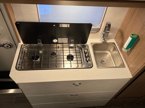 De middenkeuken is voorzien van een 3-pits gascomfoor, koelkast (142L) en vriesvak, zodat u altijd een heerlijke maaltijd kunt bereiden. In de achter-opstelling vindt u een cassettetoilet, douche en een niveaumeter voor de verswatertank.