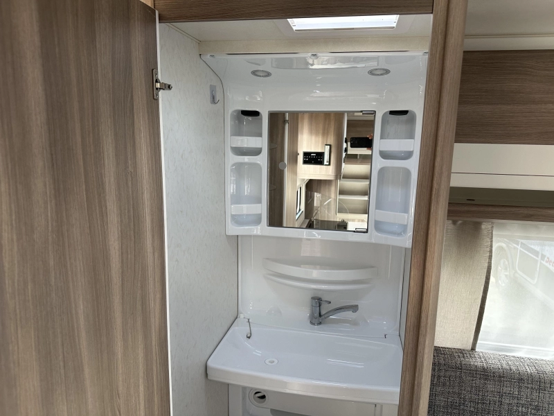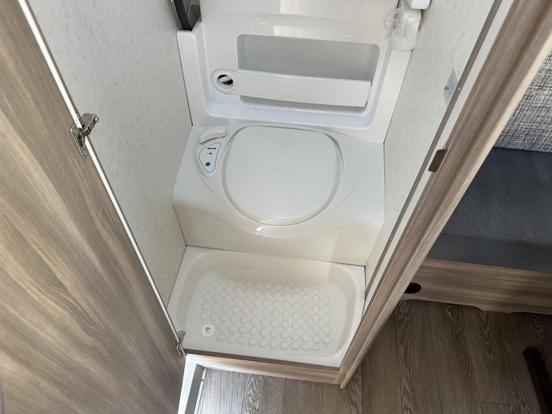 Sanitair - Achteropgestelde badkamer met: Cassettetoilet, Wastafel, Schoonwatertank