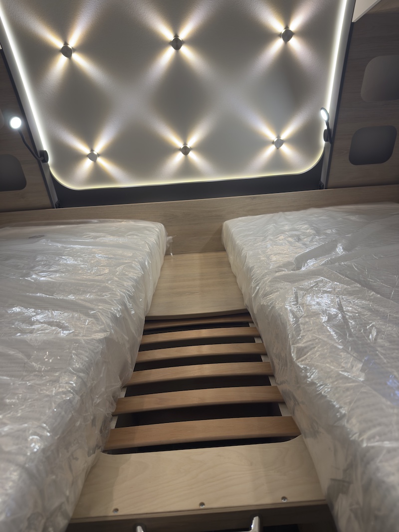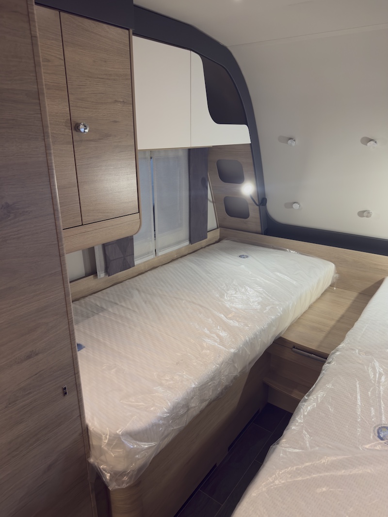 Achterin bevinden zich twee comfortabele enkele bedden (200 x 86 cm), die met de optionele rolbedfunctie omgevormd kunnen worden tot een groot tweepersoonsbed. De badkamer met middenopstelling is voorzien van een cassettetoilet, een douche en een houten vloerrooster, waardoor je altijd geniet van een frisse en comfortabele sanitaire ruimte.