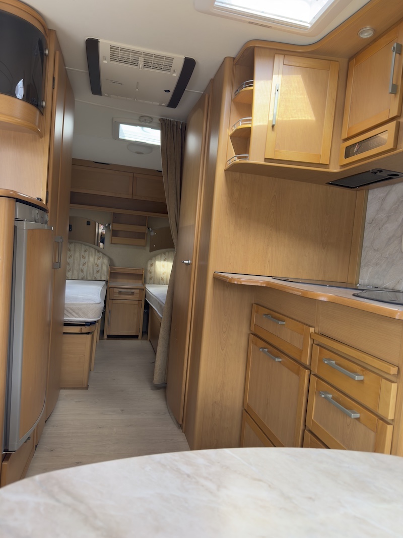 De caravan beschikt over een standaardzit met comfortabele kussens, een praktische middenkeuken en twee aparte bedden die garant staan voor een goede nachtrust. De slaapbank kan dienen als extra slaapplaats, waardoor deze caravan flexibel inzetbaar is. De midden-opstelling van het sanitair zorgt bovendien voor een slimme en praktische indeling.
