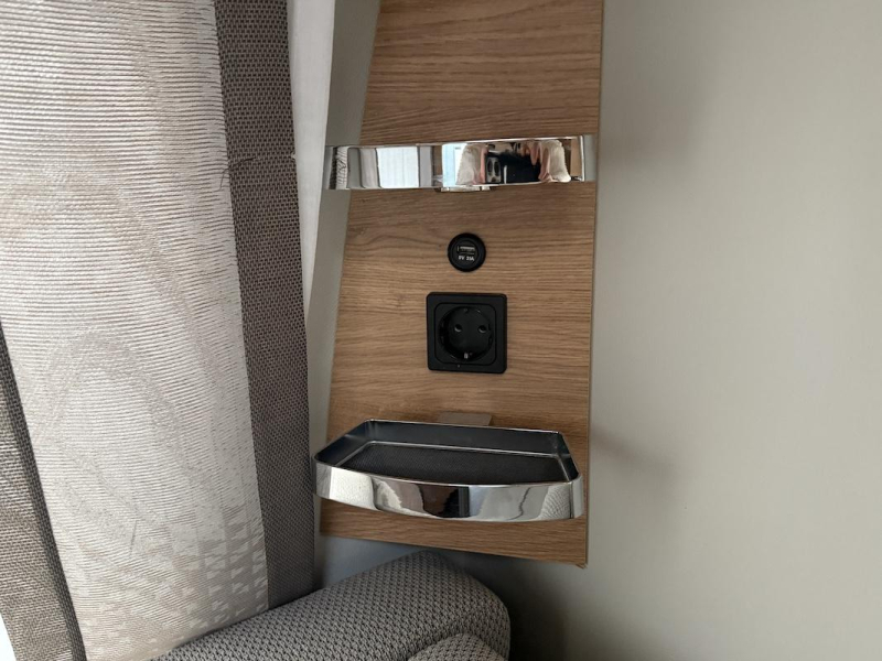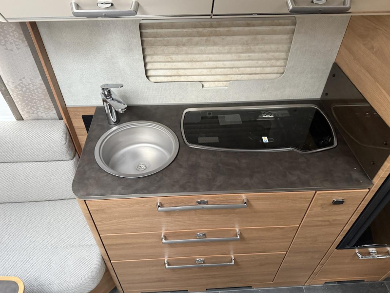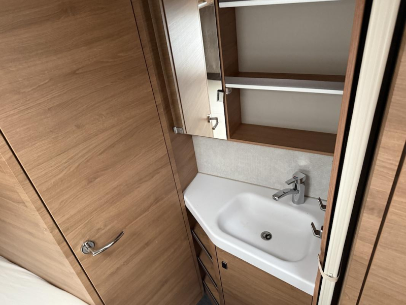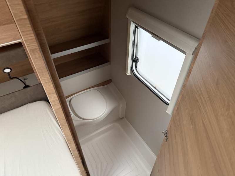 Sanitair: Hoekbadkamer met cassettetoilet, wastafel en een vaste schoonwatertank.