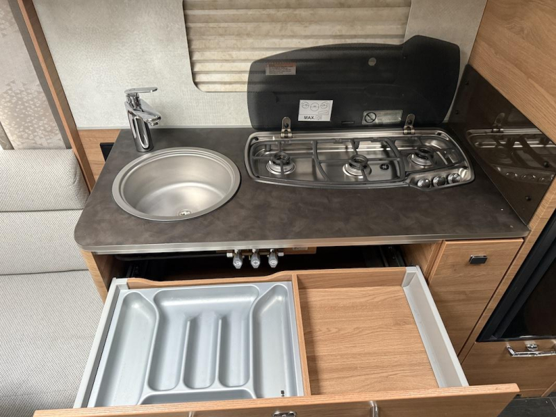 Keuken: Middenkeuken met een 3-pits gascomfoor, ruime ladekast en een boiler van 5 liter.