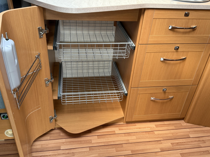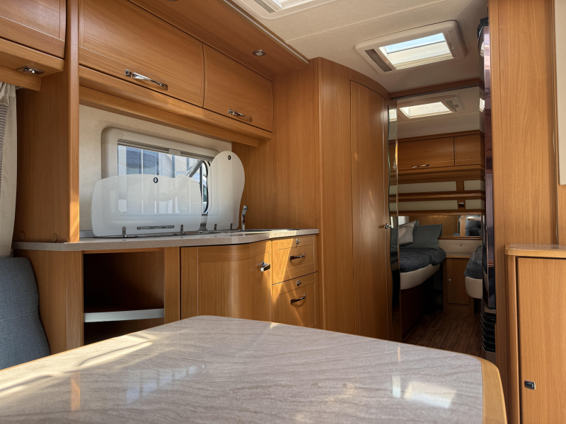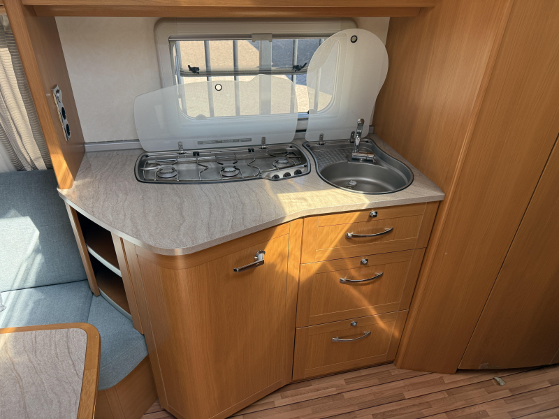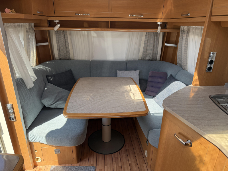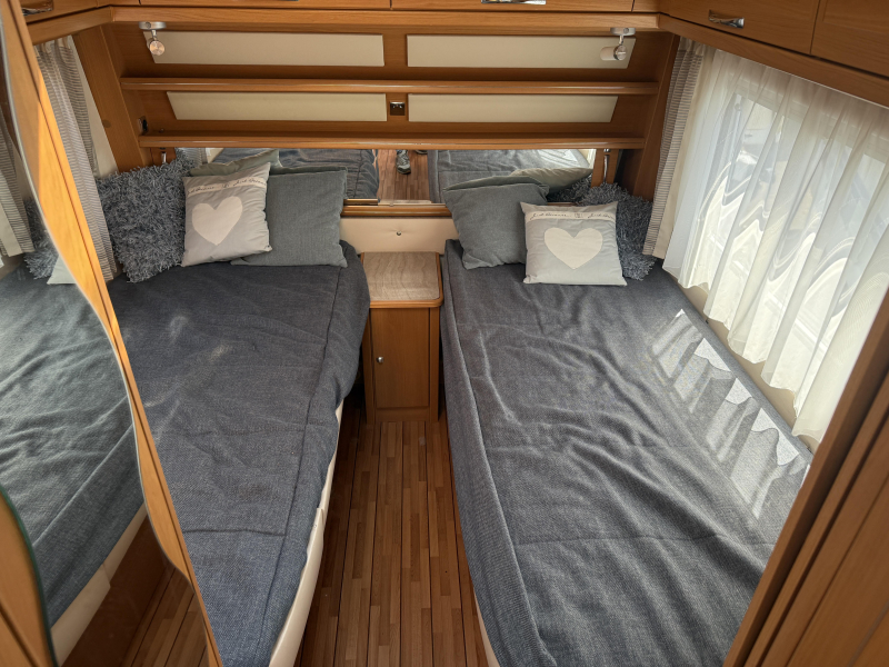 De caravan beschikt over een gezellige rondzit. De keuken in het midden is voorzien van een 3-pits gascomfoor, koelkast met vriesvak en een warmwaterboiler van 5 liter. Het slaapgedeelte biedt twee aparte bedden voor optimaal comfort. Het sanitair bevindt zich in het midden en is uitgerust met een cassettetoilet, wastafel en schoonwatertank.